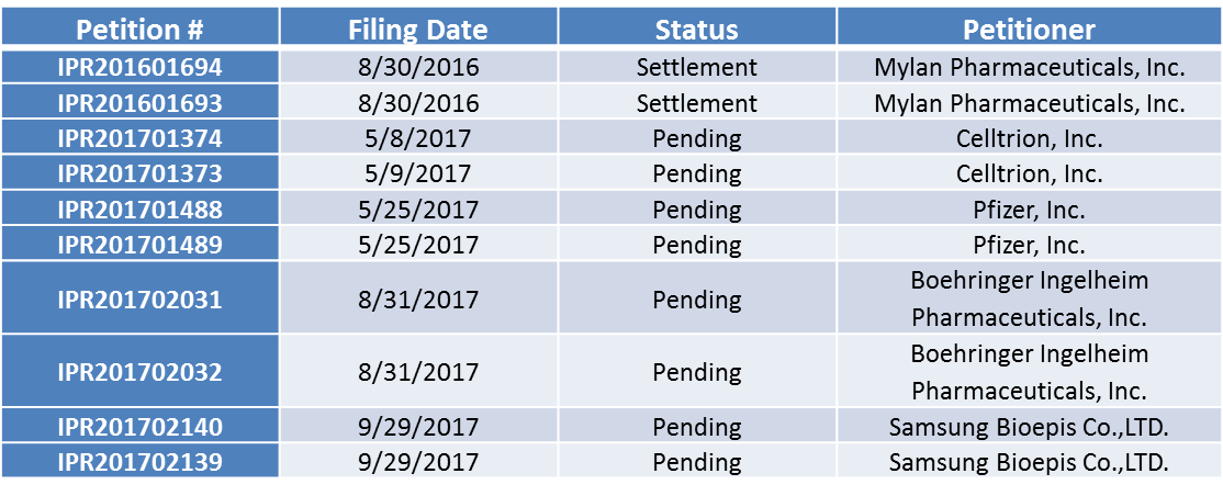 As noted in the above table, previous challenges to the ʼ213 patent have come from Mylan, Celltrion, Pfizer, and Boehringer Ingleheim.  An early challenge to the ʼ213 patent from two petitions filed by Mylan was dropped (previously reported here) following a settlement agreement that was brokered between Roche and Genentech to provide Mylan with global licenses for trastuzumab.  However, the petitions filed by Celltrion (IPR2017-01373 and IPR2017-01374), Boehringer Ingelheim (IPR2017-02032 and IPR2017-02031), and Pfizer (IPR2017-01488 and IPR2017-01489) are awaiting an institutional decision by the PTAB.