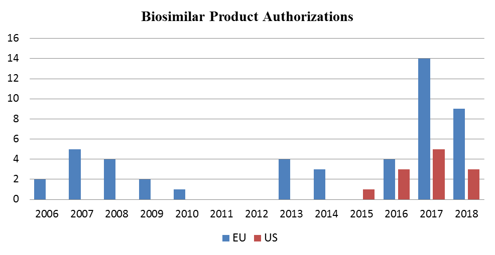 As pharmaceutical drug costs attract increasing media attention and political scrutiny, a growing number of biosimilar drugs are set to enter the U.S. and European markets in the coming years. Global sales for the top ten branded biologic drugs totaled approximately $71 billion in 2017[1]. Competition in the heavily regulated marketplace for these blockbuster therapeutics is expected to substantially impact the pharmaceutical industry and national health systems. To date, the U.S. has considerably lagged behind Europe’s expansion of biosimilar drug options. The RAND Corporation estimates that biosimilar products can save the U.S. health system approximately $54 billion over the next decade, as discussed here.