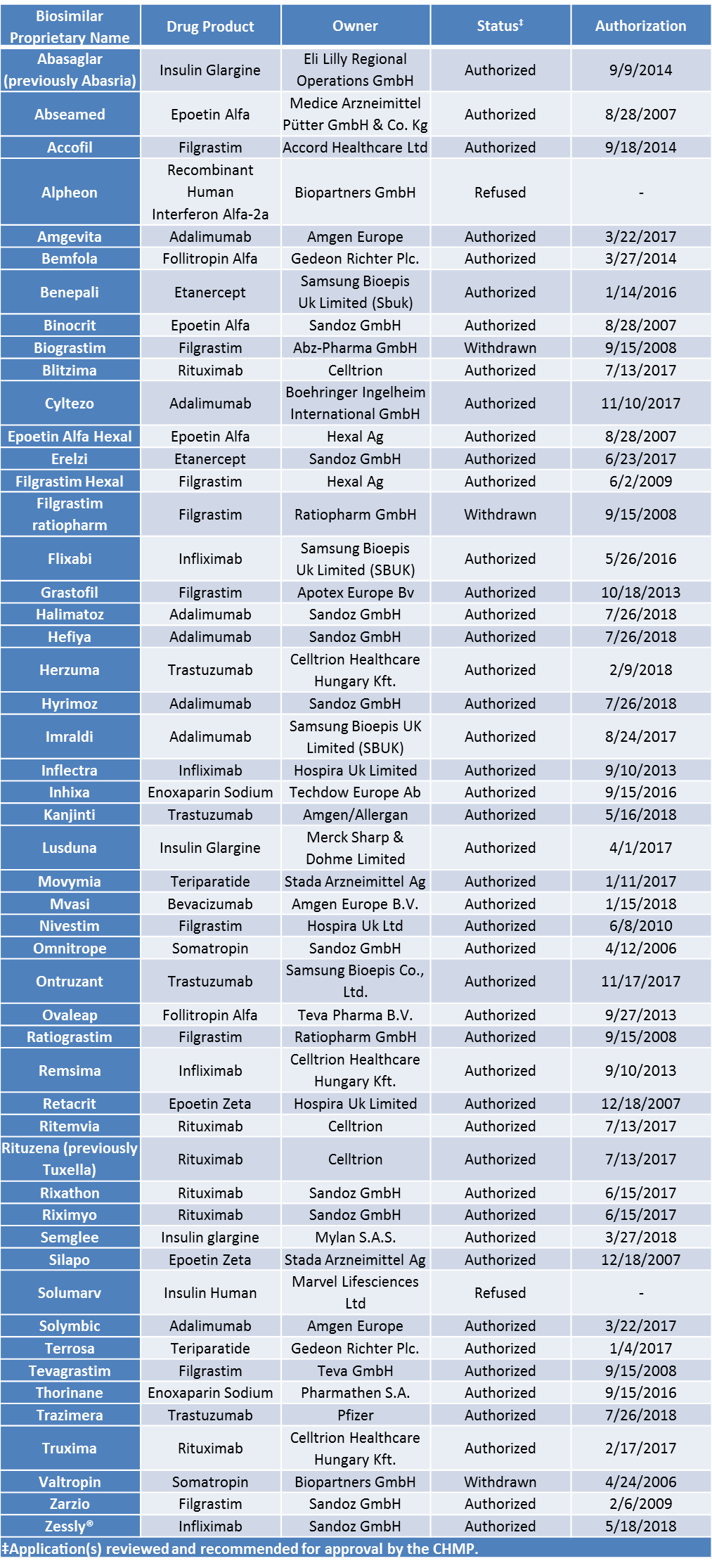 Table 1. European Medicines Agency List of Approved Biosimilar Drugs (updated August 2, 2018).