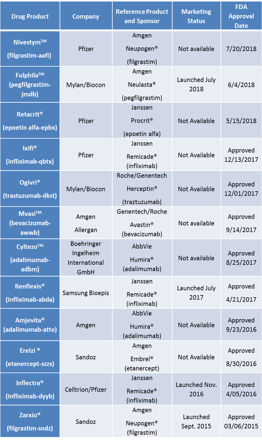 Table 2. U.S. Food and Drug Administration List of Approved Biosimilar Drugs (CDER list of licensed biologics updated on July 24, 2018).