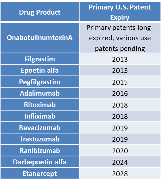 Table 4. Biologics having already expired or nearing primary patent expiry in the U.S. that have biosimilars in the regulatory pipeline.
